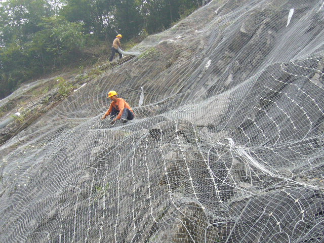 主动防护系统是用以钢丝绳网或TECCO高强度钢丝格栅为主的各类柔性网覆盖或包裹在需防护的斜坡或危石上,以限制坡面岩石土体的风化剥落或破坏以及危岩崩塌(加固作用),或者将落石控制在一定范围内运动(围护作用)。特性: 钢丝绳网 、普通钢丝格栅(常称铁丝格栅)和TECCO高强度钢丝格栅构造:前两者通过钢丝绳锚杆和/或支撑绳固定方式,后者通过钢筋(可施加预应力)和/或钢丝绳锚杆(有边沿支撑绳时采用)、专用锚垫板以及必要时的边沿支撑绳等固定方式。 系统的开放性,地下水可以自由排泄,避免了由于地下水压力的升高而引起的边坡失稳问题;该系统除对稳定边坡有一定贡献外,同时还能抑制边坡遭受进一步的风化剥蚀,且对坡面形态特征无特殊要求,不破坏和改变坡面原有地貌形态和植被生长条件,其开放特征给随后或今后有条件并需要时实施人工坡面绿化保留了必要的条件,绿色植物能够在其开放的空间上自由生长,植物根系的固土作用与坡面防护系统结为一体,从而抑制坡面破坏和水土流失,反过来又保护了地貌和坡面植被,实现最佳的边坡防护和环境保护目的。特点: 1、适应任何坡面地形,特别是破碎的山体。 2、工程安装快捷易用 3、通过人工植草、植物绿化、保持土体、岩石的稳固、安全环境 4、防护能力强 5、系统寿命长、可达30-50年。