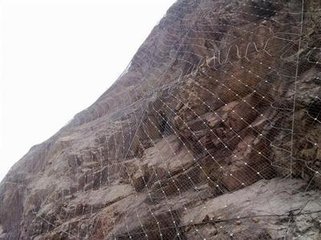被动防护是由钢丝绳网、环形网、(需拦截小块落石时附加一层铁丝格栅)、固定系统(锚杆、拉锚绳、基座和支撑绳)减压环和钢柱四个主要部分构成。钢柱和钢丝绳网连接组合构成一个整体,对所防护的区域形成面防护,从而阻止崩塌岩石土体的下坠,起到边坡防护作用。