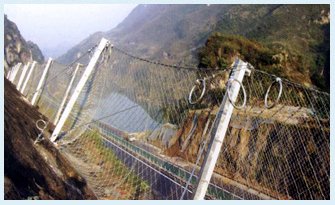 被动防护是由钢丝绳网、环形网、(需拦截小块落石时附加一层铁丝格栅)、固定系统(锚杆、拉锚绳、基座和支撑绳)减压环和钢柱四个主要部分构成。钢柱和钢丝绳网连接组合构成一个整体,对所防护的区域形成面防护,从而阻止崩塌岩石土体的下坠,起到边坡防护作用。